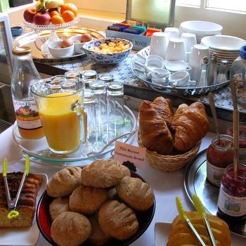 You will have a self-serve buffet with delicatessen, butter, eggs, yogurts, fresh fruit, cakes, sweet buns...
