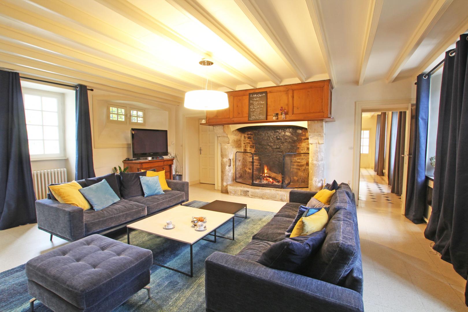 Nestling on the 2nd floor of the manor, this spacious and bright room is finished in moderate tones, enhanced with ochre to match the exposed ceiling beams. A sofa and an armchair enable our guests to read and relax.