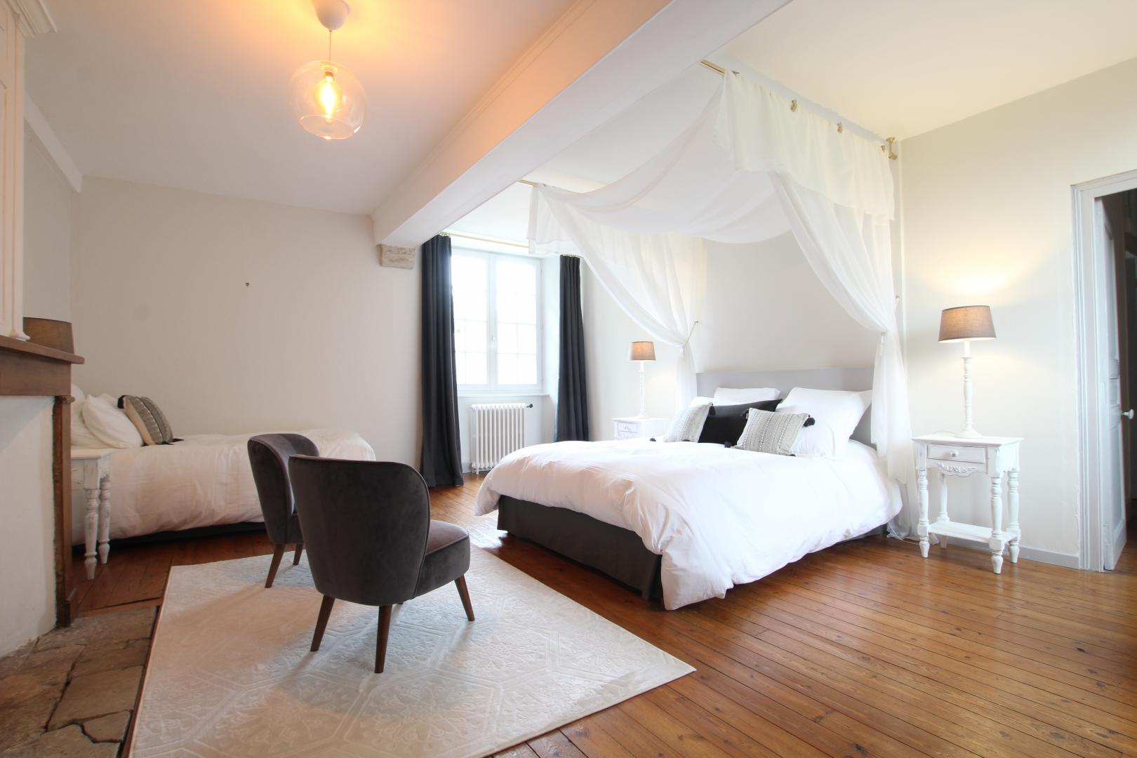 Situated on the 1st floor this large room affords a lovely view over the garden and the stables. The main feature of this bright room is the canopy bed. The atmosphere created is warm andrelaxing.