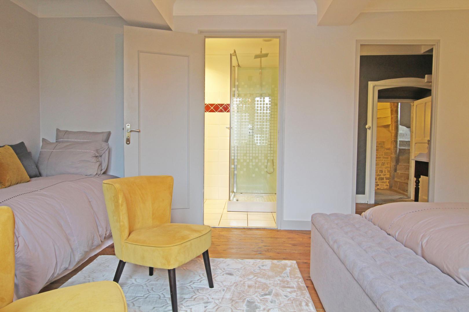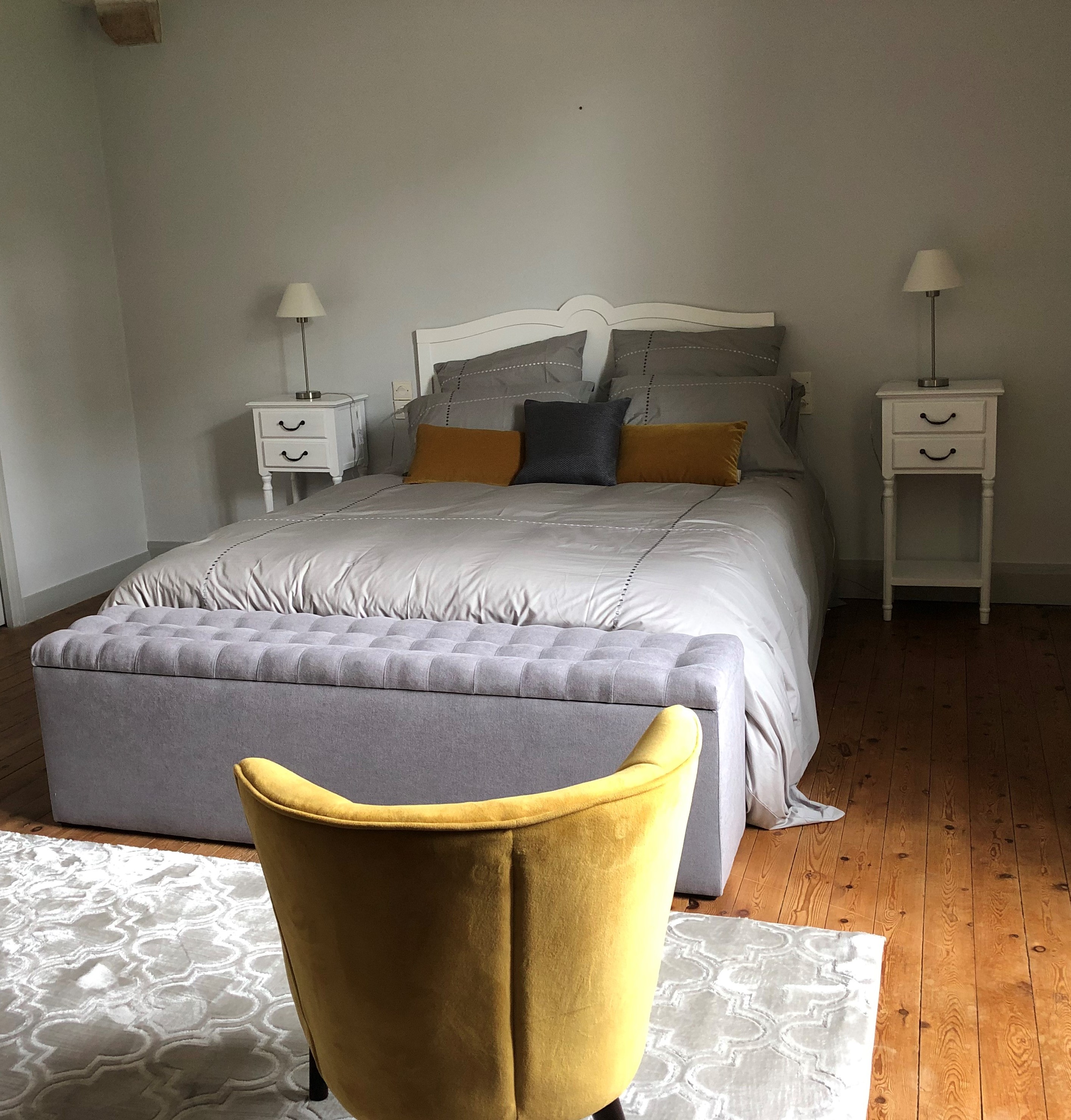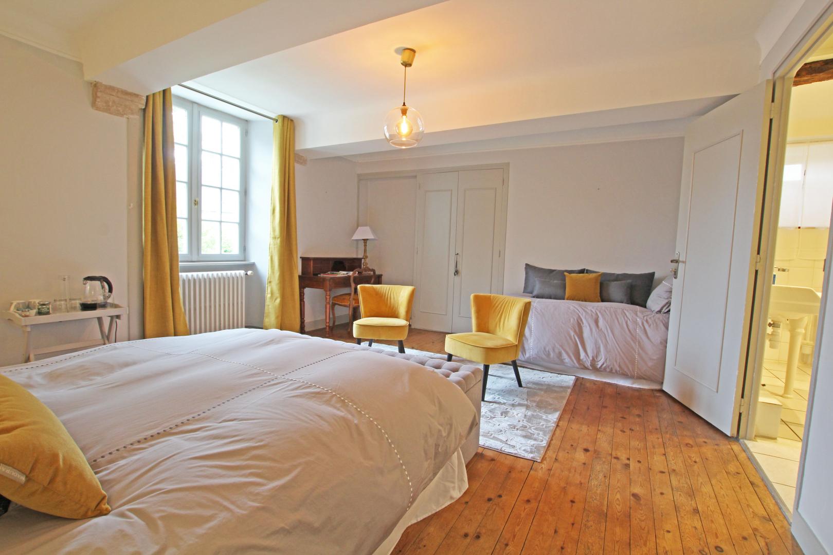 Décorée dans les tons gris et réhaussée d'ocre, la chambre Clair de Lune, spacieuse et confortable dégage une atmosphère apaisante. Couchage : un lit de160 et un lit de 90.